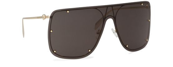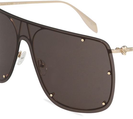The assertive style of these oversize pilot sunglasses is detailed with metallic finishes and narrow temples adorned with the Alexander McQueen logo and iconic symbol of this British brand.