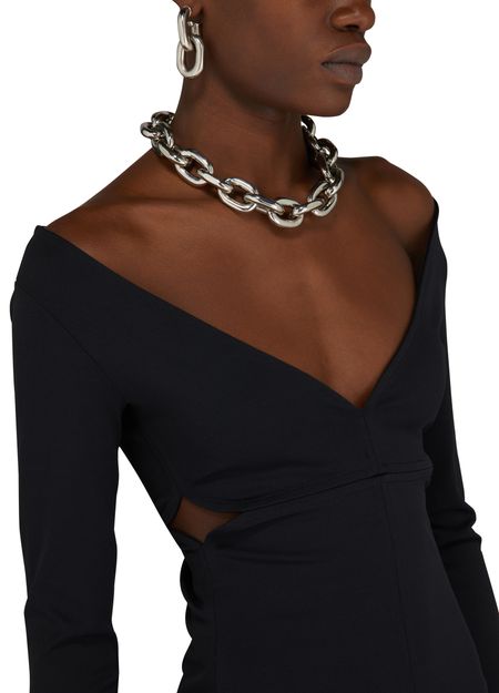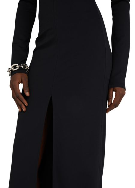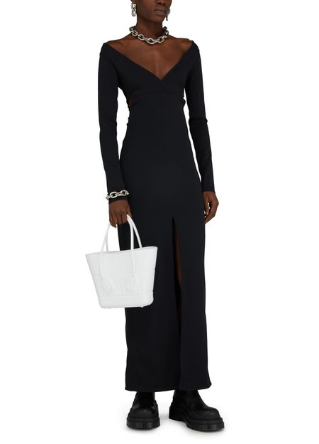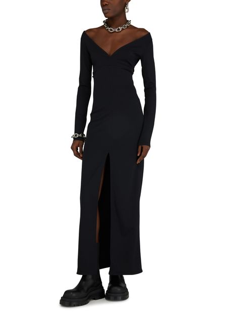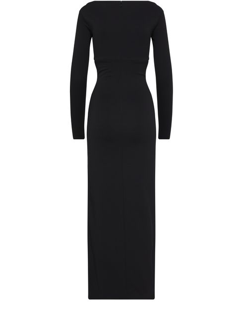 The Swallow Breast LS Milano Dress is a sophisticated and elegant piece with a tailored fit, long-sleeved silhouette, and a flattering maxi length. Featuring a striking front slit, V-neckline, and intricate graphic cut-outs, this dress exudes modern style and refined charm. Perfect for special occasions or evening events.