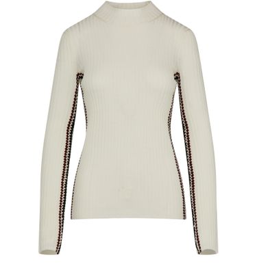 This Chloé knit sweater features long sleeves and a mockneck, with ribbed detailing throughout. Embroidered and contrast details add a touch of elegance to the slim fitting design.