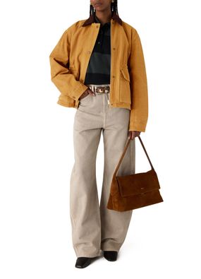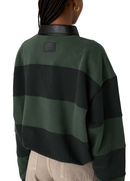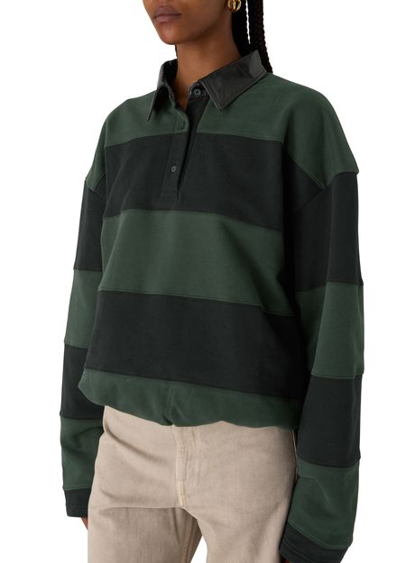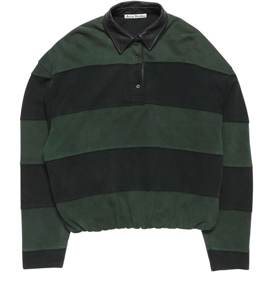 Reveal Acne Studios's polo-neck sweatshirt, a modern essential with long sleeves and a sleek button fastening. The cropped silhouette and bold stripes create a statement look, perfect for layering or pairing with high-waisted pieces for a fresh, urban edge.