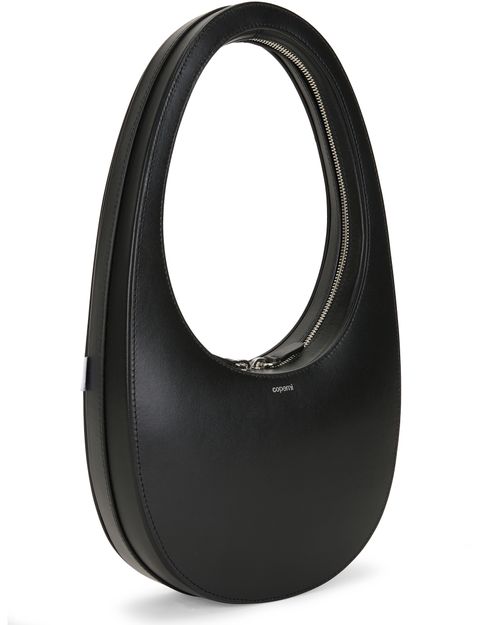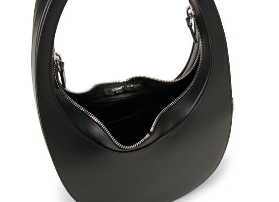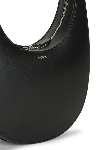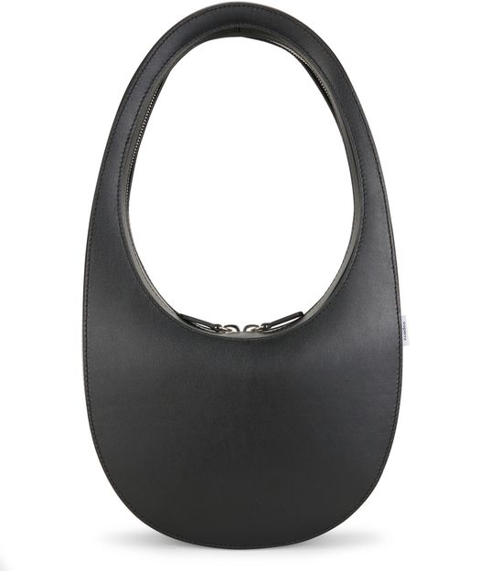Description : Logo printed on the front, leather handle, visible stitching, label with logo on the outside, circular zipper closure, worn in the hand or on the shoulder.