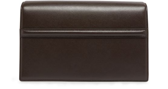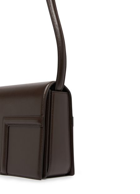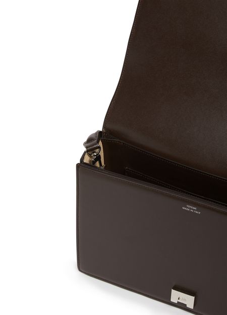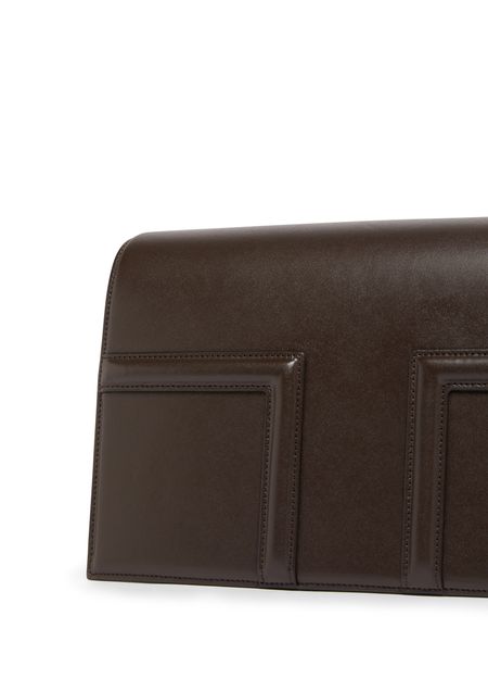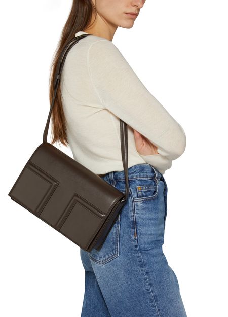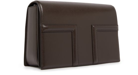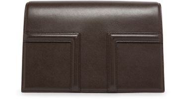 T flap bag is a sleek and versatile accessory with a thin strap that can be worn on the shoulder or crossbody. It features a detachable strap and gold finish details, including a printed logo on the front. The bag's interior offers convenient patch pockets, and its single compartment is secured with a flap closure and single handle for a chic and timeless design.