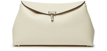Toteme's T-Lock leather clutch bag combines elegance with practicality. Featuring a silver finish and a printed logo on the front, it boasts a flap closure for secure access. With interior patch pockets and a single handle, it can be worn on the shoulder or crossbody thanks to the adjustable thin strap.