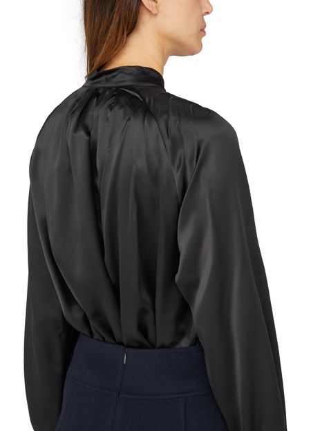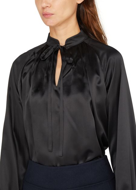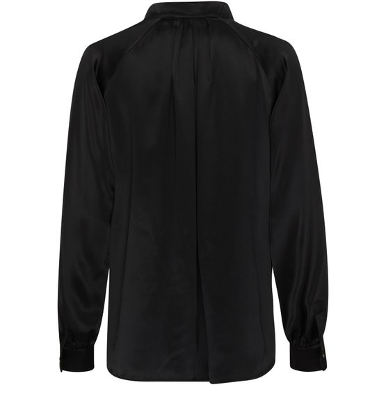 • Description : Iridescent material, flowing fit, adjustable drawstring neckline, long sleeves, cuffs, pleated details.