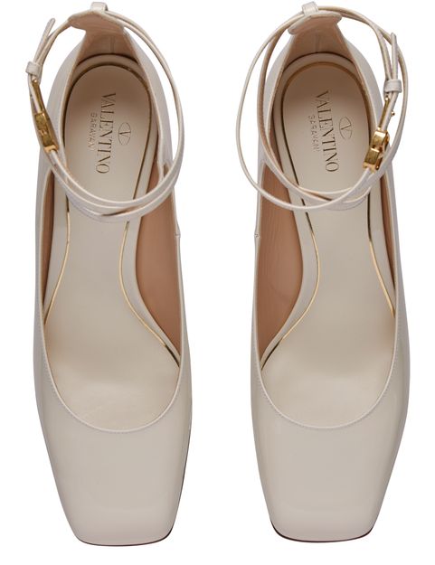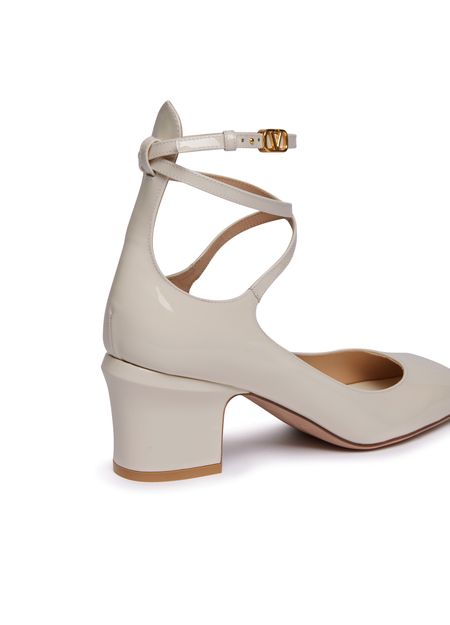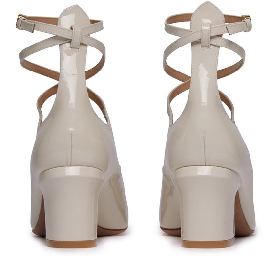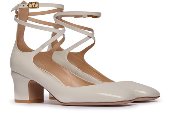 Tan-go pumps with ankle straps are crafted from glossy patent leather, featuring a slightly rounded toe and a very thin sole. They are elevated with a stylish square heel and adorned with the iconic Vlogo Signature detail. The contrasting details add a touch of elegance to these chic and versatile pumps.