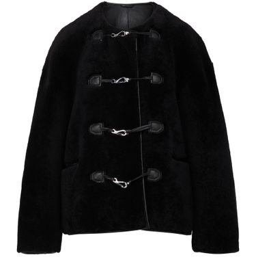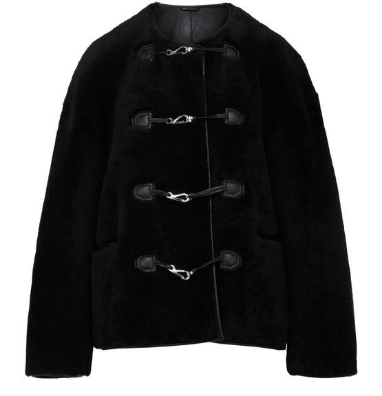 Teddy shearling clasp jacket is a collarless jacket crafted from warm fabric, perfect for chilly days. With its loose fit and long sleeves, it provides both style and comfort. The jacket features carabiners for a unique touch, while side pockets offer practicality.