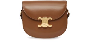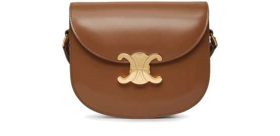 Celine's Clea besace Triomphe in shiny calfskin is a stunning accessory that elevates any look. Its gold finish gleams under the light, while the metallic logo on the front adds a touch of sophistication. With a thin strap for versatility, it can be hand carried or worn crossbody, featuring a snap-button fastening and a zippered interior pocket for practicality. This piece is the perfect blend...