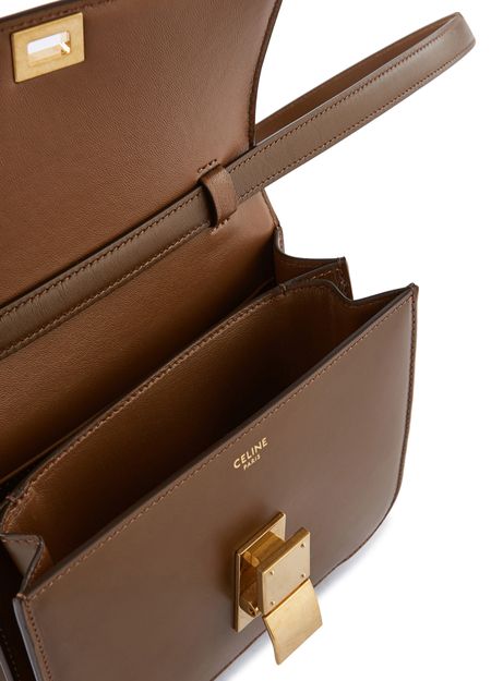 Celine presents the Classic Teen box calf leather bag in one of its flagship shapes. This model is offered here with a very angular metal clasp. Smooth leather gives shine to this leather accessory that brings an understated and elegant touch to your outfit. It can be worn over the shoulder or across the body thanks to its shoulder strap.