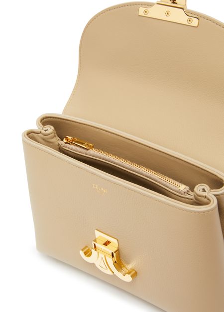 Celine's Teen Nino bag in supple calfskin is a versatile companion for any occasion. With its Triomphe metallic closure, it effortlessly transitions from hand carry to shoulder carry or cross-body carry. Featuring two main compartments, inner flat pockets, and a zipped pocket, it combines elegance with practicality, making it a must-have accessory.