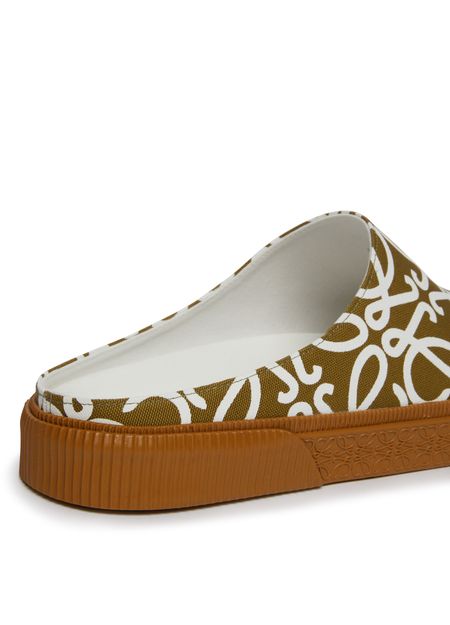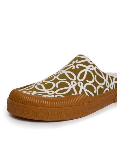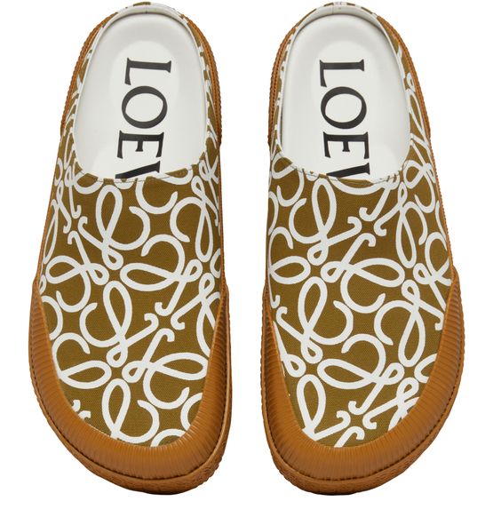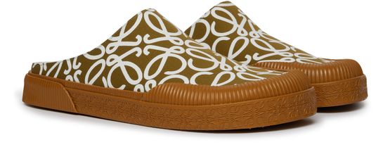 The Loewe Terra Vulca slip-on is a luxurious footwear option that boasts a very soft and comfortable texture. It features a thick outer sole, providing excellent support and durability. The shoe is adorned with an all-over logo design, showcasing the brand's emblematic pattern, adding a touch of sophistication to any outfit.