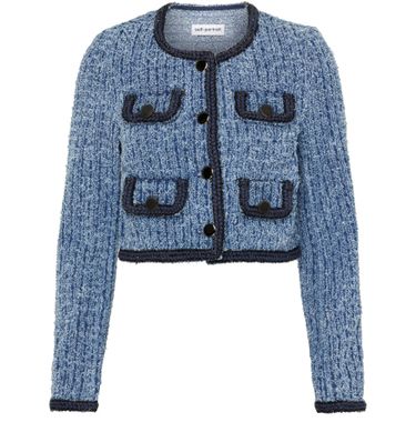 Self Portrait's textured denim jacket showcases a short, long-sleeved silhouette with a stylish front buttoned closure. The collarless design adds a modern twist, while flap pockets offer practicality. A subtle logo at the back label signifies quality, making this piece a must-have for effortless, chic layering.