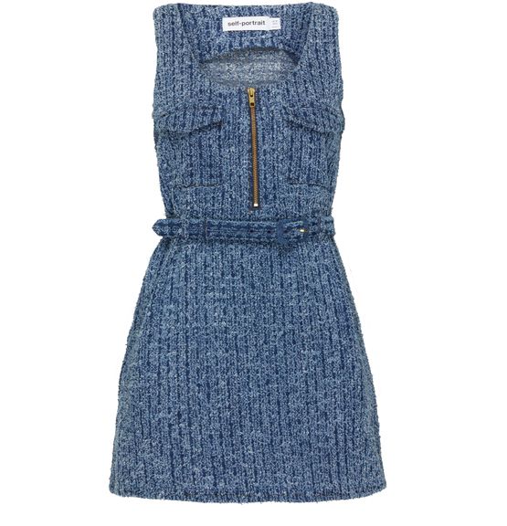 Self Portrait's Textured denim mini dress showcases a sleeveless design with a round neck and a flattering belted waist. Featuring a zipper closure and stylish patch pockets, this flared dress includes a detachable belt made from the same fabric. A logo at the back label adds a touch of elegance.