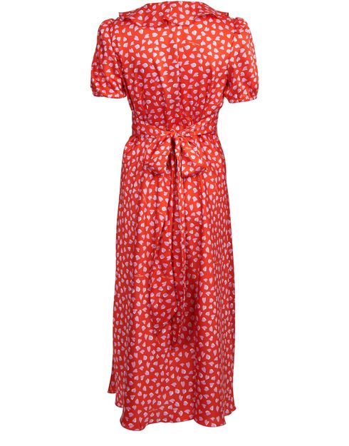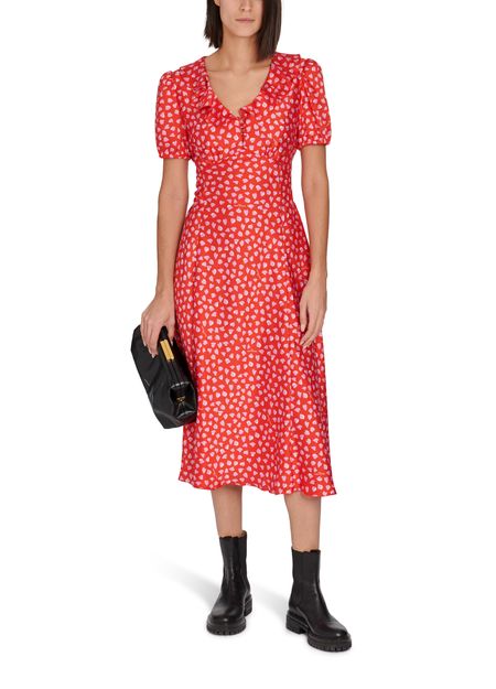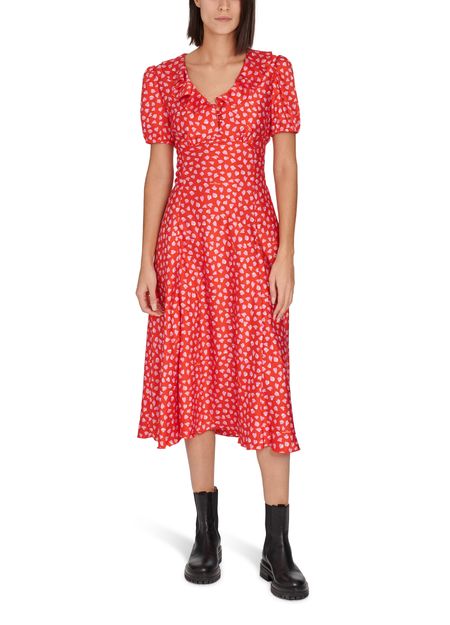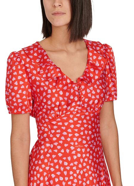 • Description : Pleat and gather details, ruffle details, two-tone print, v-neck, fastening with bow, flared cut, short sleeves, empire line.