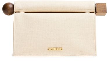 • Description : Folded clutch in linen, lambskin leather trim, "round square" detail, metallic "jacquemus" logo, front logo, magnetic closure, visible topstitching, fully lined in cotton.