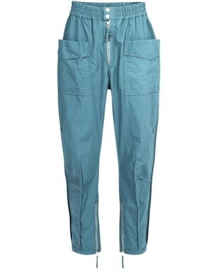Description : Elasticated waist pants, side pockets, patch pockets on the back Visible stitching, oversized lines, press stud fastening, zipper fastening.