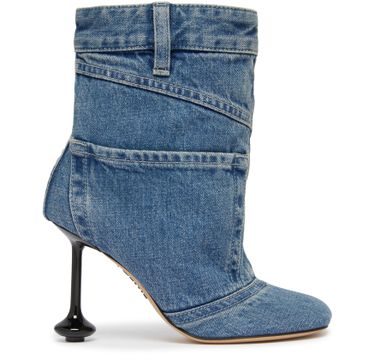 Loewe's Toy panta ankle boot 90 is a high heel, closed boot with a unique heel, round toe, and high-top upper.