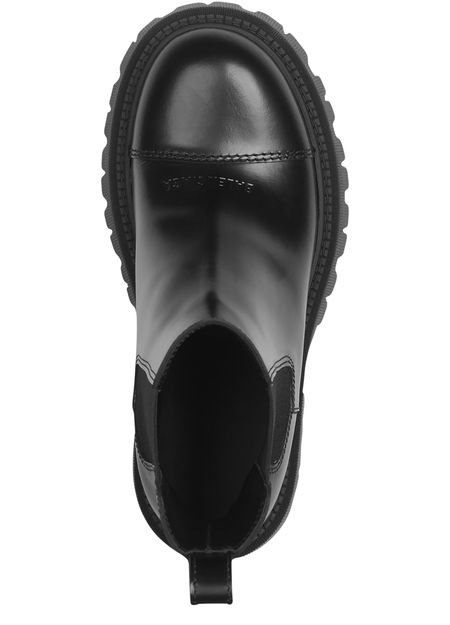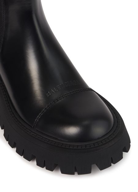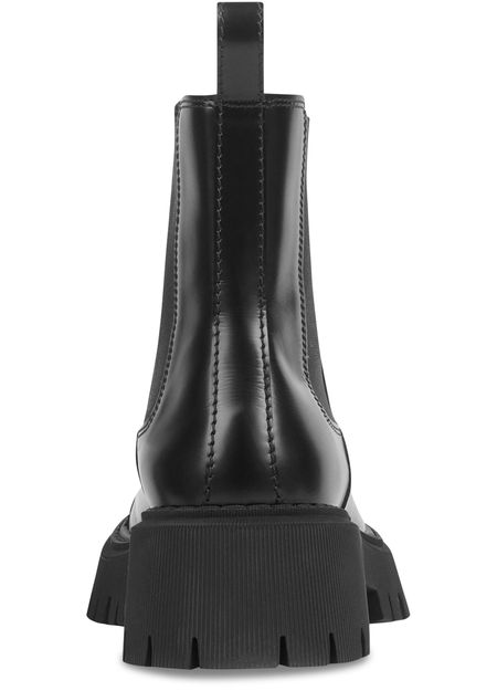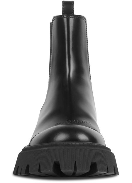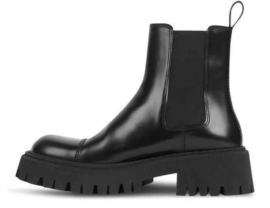 Description : Chelsea ankle boots, smooth leather, round toe, balenciaga logo embossed on the front, visible stitching, elasticated sides, leather loop at the back for easy slipping on and off, thick, notched sole.