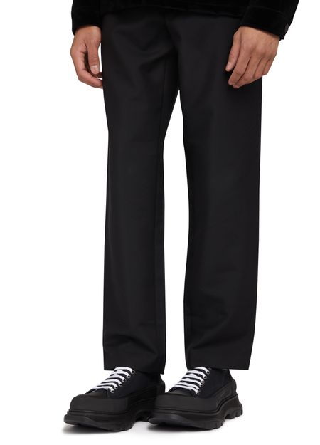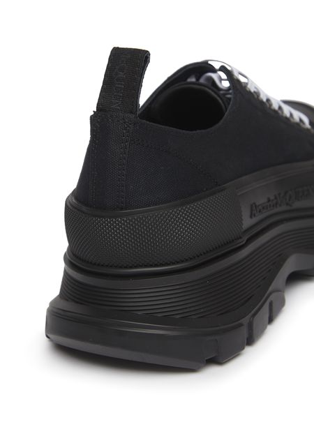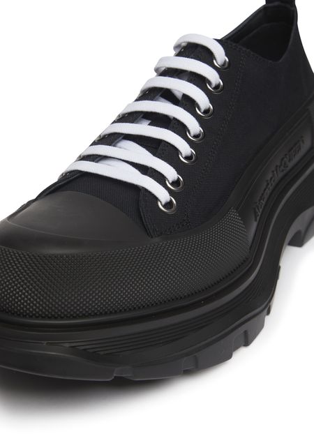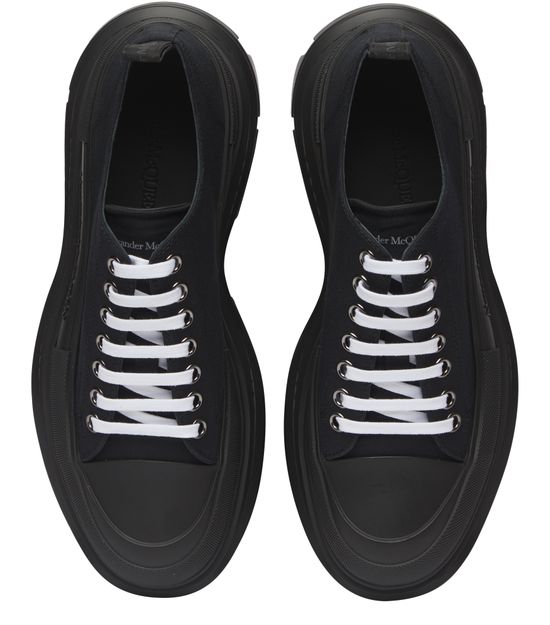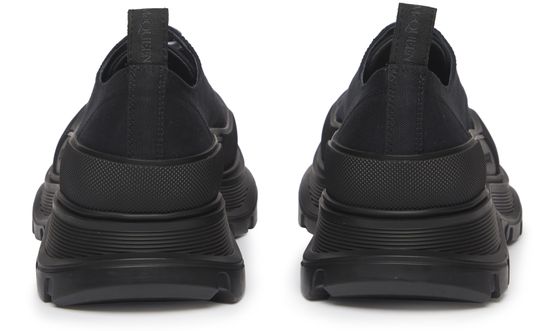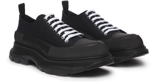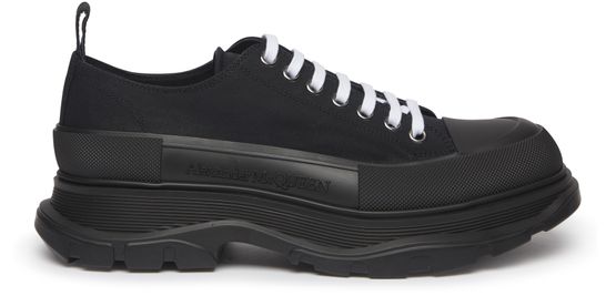 Step into edgy sophistication with Alexander McQueen's Lace-up Tread Slick Sneakers. The thick, notched sole provides both style and stability, while the logo on the side adds a subtle branding touch. Made from high-quality materials, these sneakers feature an embossed logo for a luxurious finish. Elevate your urban style effortlessly.