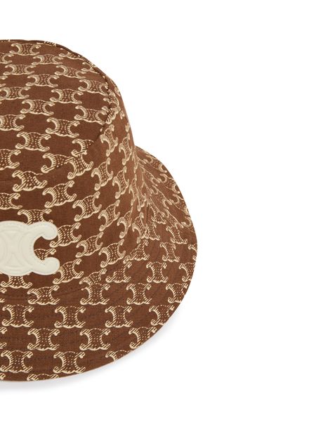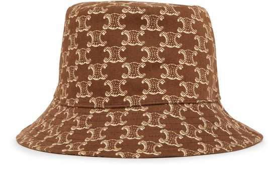 Celine's Triomphe bucket hat is a stylish accessory crafted from exquisite monogram canvas. Adorned with a logo at the front, it effortlessly elevates any ensemble. This hat combines contemporary flair with classic charm, making it a must-have for those who appreciate luxury and seek to make a fashionable statement.