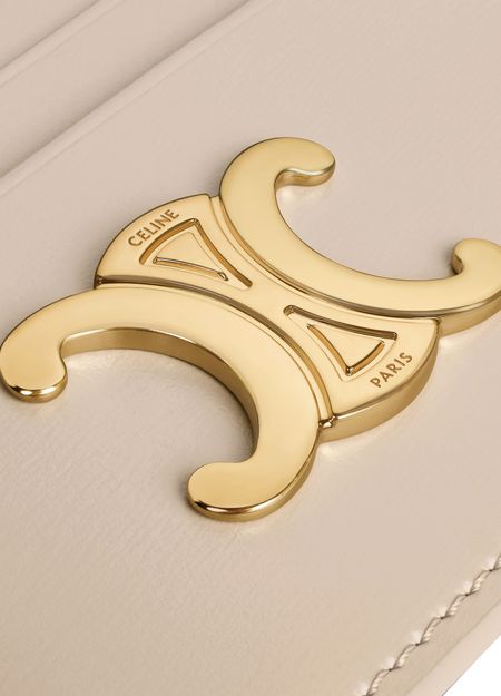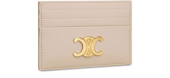 Celine's Triomphe card holder in shiny calfskin embodies elegance and functionality. With its luxurious gold finish, it features six credit card slots and a flat pocket for essentials. Adorned with a decorative metal triumph, this card holder is a sophisticated accessory that elevates your everyday style effortlessly.