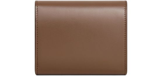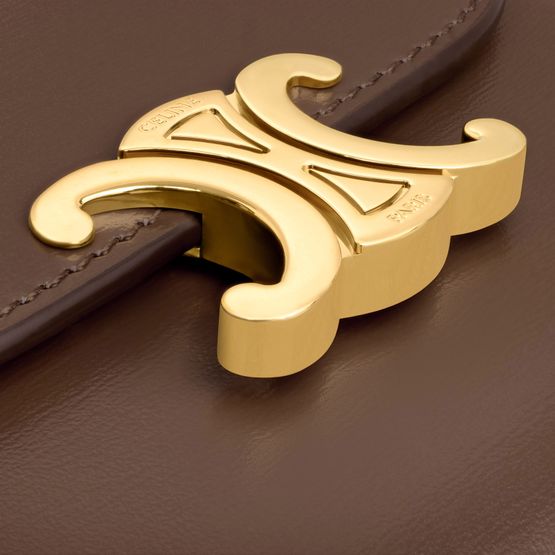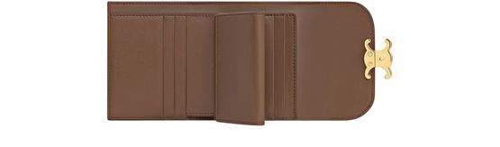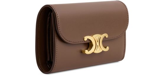 Celine's Triomphe small flap wallet in shiny calfskin is a luxurious accessory that embodies elegance. With its gold finishing and a triomphe metallic snap button closure, it offers both style and functionality. Featuring a folded coin pocket, five credit card slots, a note pocket, and a flat pocket, it's perfect for the modern individual.