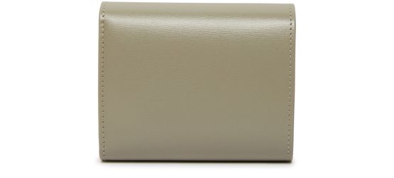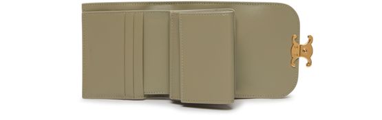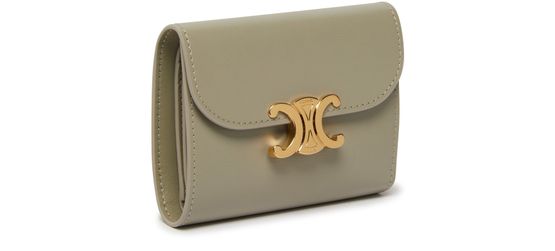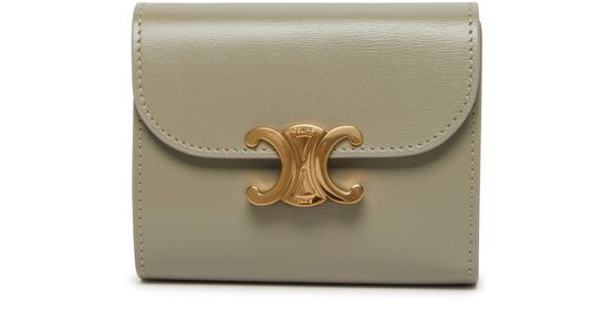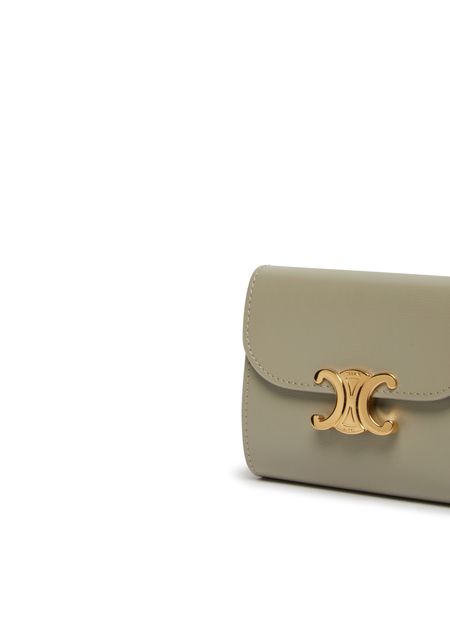 Celine's Triomphe small flap wallet in shiny calfskin is a luxurious accessory that embodies elegance. With its gold finishing and a triomphe metallic snap button closure, it offers both style and functionality. Featuring a folded coin pocket, five credit card slots, a note pocket, and a flat pocket, it's perfect for the modern individual.