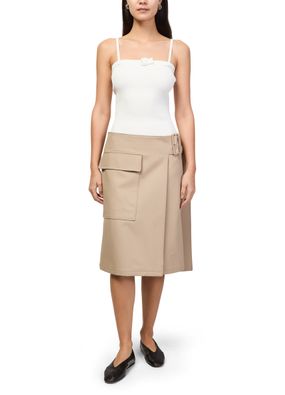 Reveal Courreges's utility buckle cotton skirt, a knee-length wrap skirt crafted from soft cotton. Flap pockets and visible stitching add a modern edge, while the adjustable buckle detail ensures a tailored fit. Effortlessly versatile, this piece transitions seamlessly from daywear to evening sophistication.