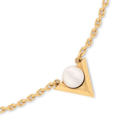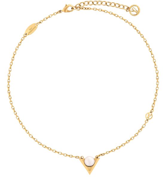 Created for the Spring-Summer 2025 Cruise collection, the V For Vuitton Pearl And Metal necklace is a poetic tribute to contemporary femininity. Its centerpiece is a radiant white resin pearl, delicately nestled on a signature V-shaped pendant in gold-toned metal. This resplendent necklace adds a touch of dazzle to an evening outfit, ideal for special occasions.