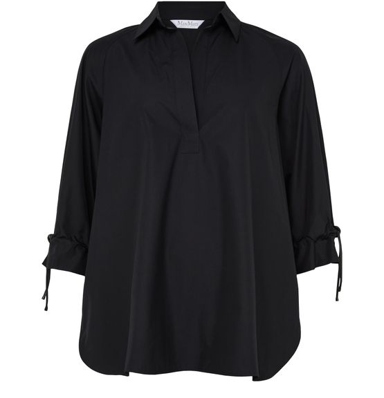 Reveal Max Mara's v-neck blouse, a refined top featuring three-quarter sleeves and a flattering neckline. The elegant silhouette and subtle detailing make it a versatile choice, easily paired with tailored pants or skirts for both professional and casual occasions.