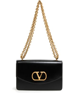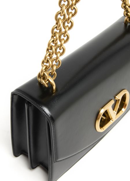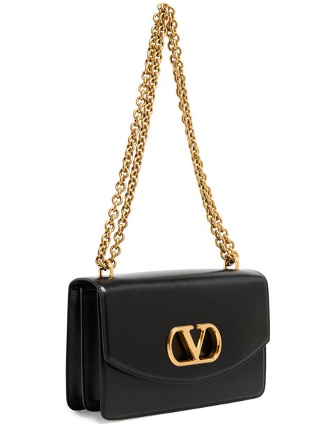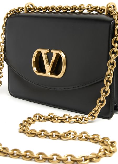 Valentino's Vain shoulder bag is a chic mini bag with a magnetic flap closure, offering a single compartment for essentials. Adorned with a metallic logo on the front and visible topstitching, it features double handles and a chain strap, allowing it to be hand carried or worn on the shoulder.