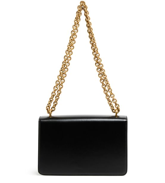 • Description : magnetic closure, flap closure, single compartment, gold finish, double handles, metallic logo on the front, visible topstitching, hand carried, worn on the shoulder, chain strap.