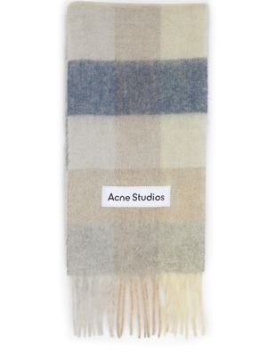 Reveal Acne Studios's Vally scarf, a statement piece featuring a checked pattern and refined fringed edges. The front logo adds a signature touch, making this scarf a modern essential for elevating any ensemble with effortless sophistication.