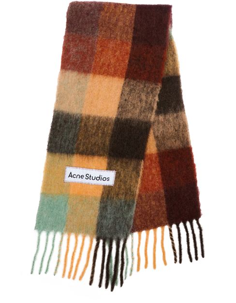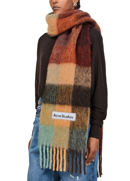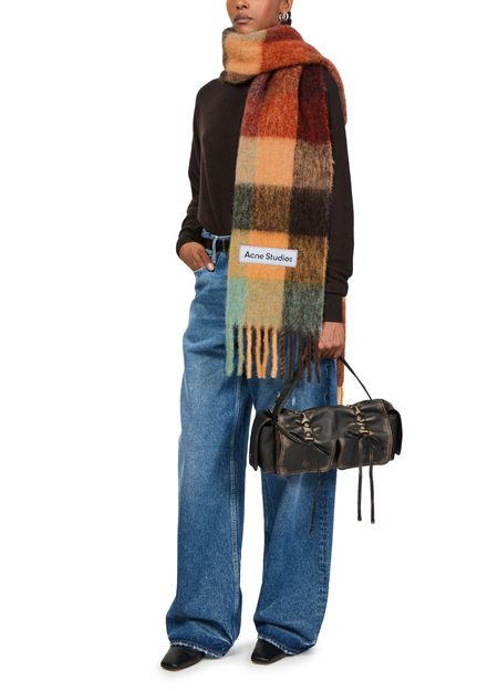 Wrap yourself in the luxurious Acne Valley Scarf with fringes. Made from a very soft material, this scarf features a classic check pattern and fringe finishes for a stylish touch. The label with logo adds a subtle branding detail. Stay cozy and chic in this timeless and versatile accessory.