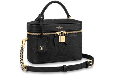With its elegantly modern shape, leather top handle, and subtle embossed Giant Monogram pattern, the Vanity PM handbag is the perfect day-to-evening bag. It features two leather-tassel zip pulls for easy opening and a padlock for secure closure. The adjustable and removable leather strap is adorned with a small chain, interwoven with the leather.