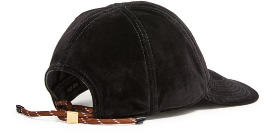 Miu Miu's Velvet cap showcases a round crown design adorned with embroidered details. Its logo at the front and embroidered logo create a striking focal point, while visible stitching adds a touch of sophistication. The curved visor completes this stylish accessory, making it a perfect choice for any casual outfit.
