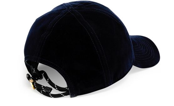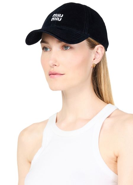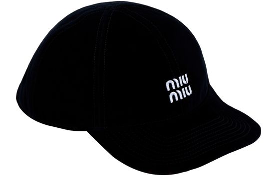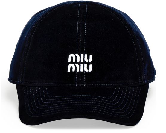Miu Miu's Velvet cap showcases a round crown design adorned with embroidered details. Its logo at the front and embroidered logo create a striking focal point, while visible stitching adds a touch of sophistication. The curved visor completes this stylish accessory, making it a perfect choice for any casual outfit.