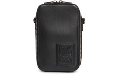 Loewe's Vertical crossbody pocket is made of smooth leather with a wide shoulder strap and zipper closure. It has an embossed logo and metal finishes. The logo is also featured on the shoulder strap. This versatile bag can be worn on the shoulder or crossbody for a modern and chic look.