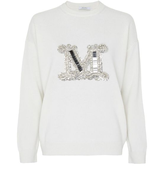 Max Mara's Vicolo M sweater showcases a regular length, long-sleeved design with a classic crew neck. Adorned with sequin details, it features an appliquéd logo at the front and a logo at the back label, effortlessly blending elegance and casual style for any occasion.