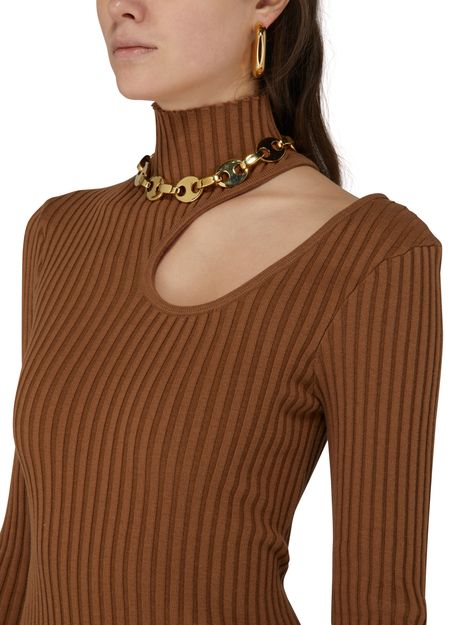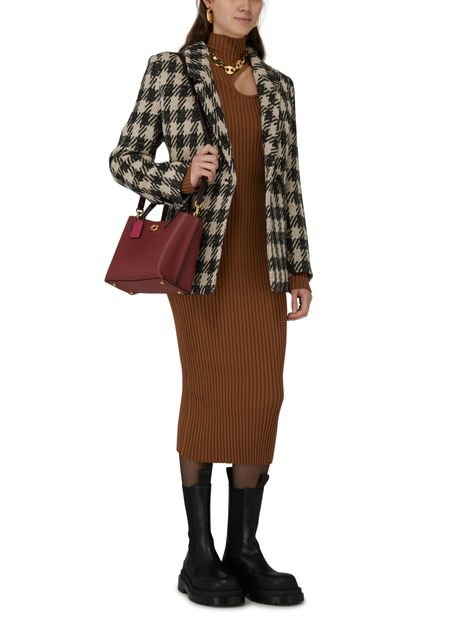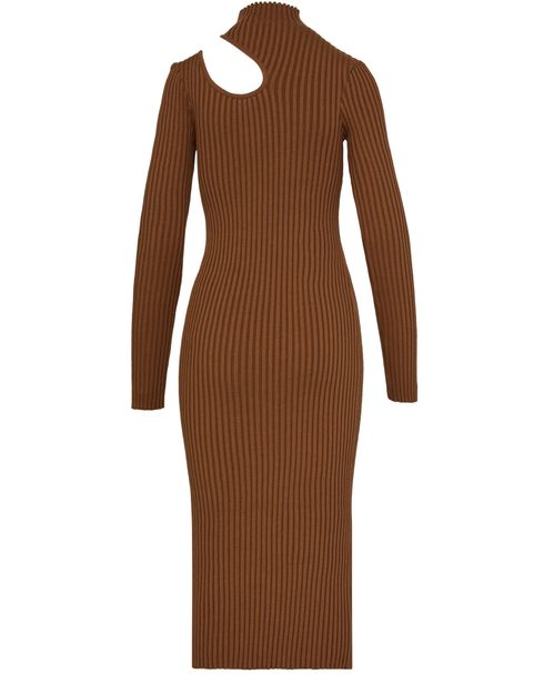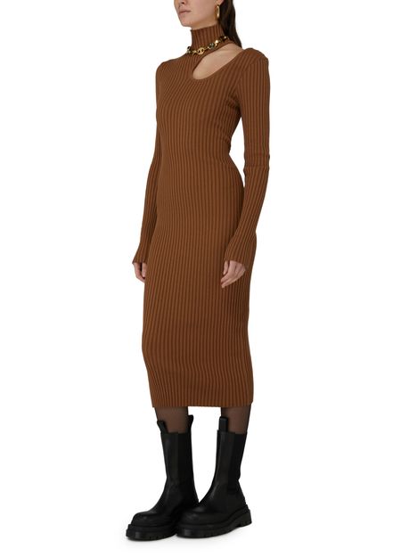 Victoria dress is a knitted maxi dress with a tailored fit, perfect for a sophisticated and elegant look. It features a mockneck and long sleeves, giving it a timeless and chic appearance. The dress also includes a graphic cut-out detail, adding a modern and edgy touch to the classic silhouette.