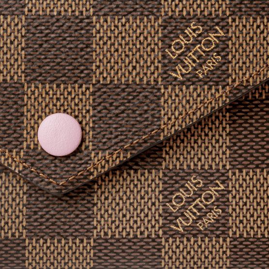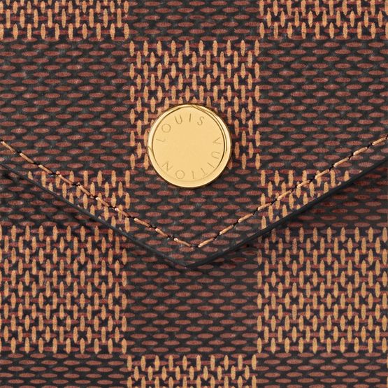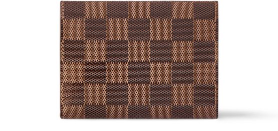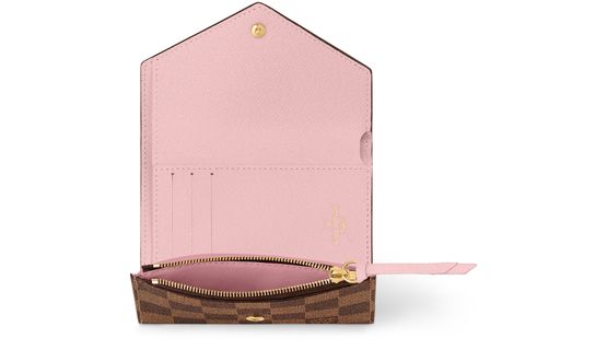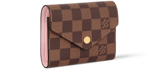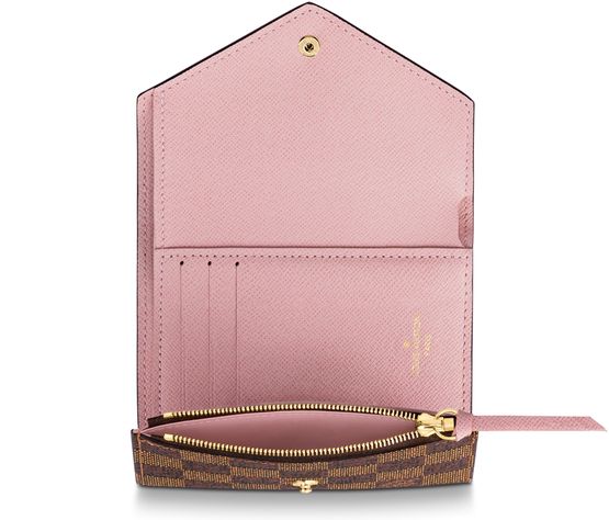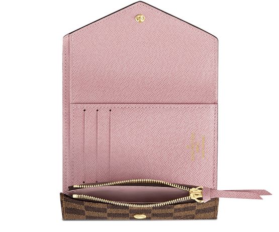 The Victorine wallet in Damier Ebene canvas is a compact, envelope-style design which opens out to reveal a range of practical features. It includes space for bills and cards, and a zipped coin pocket on the side.