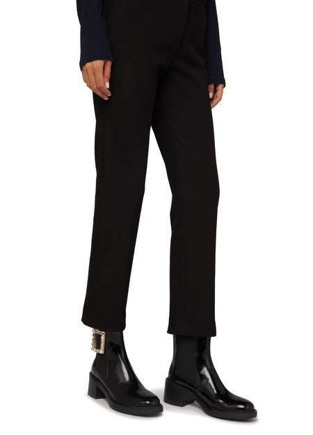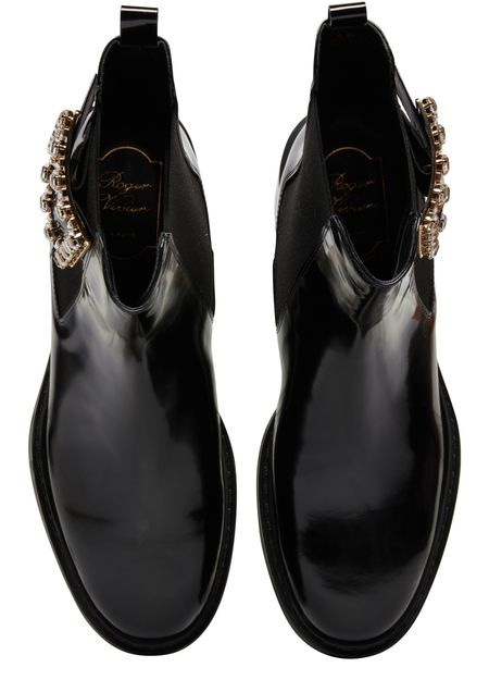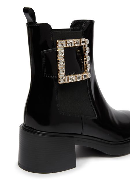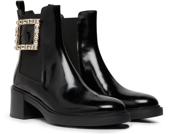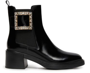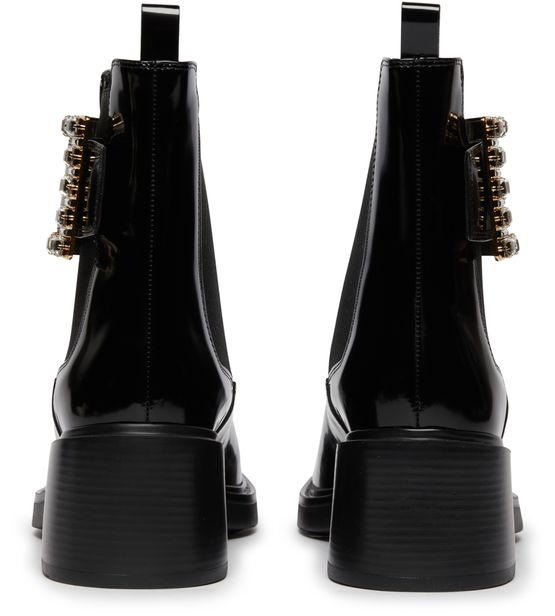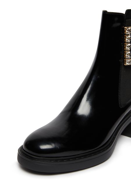 Description : closed, round toe, pull-on design, elasticated sides, block heel, medium heel, high-top upper, studded details, leather loop at the back for easy slipping on and off, chelsea boots.