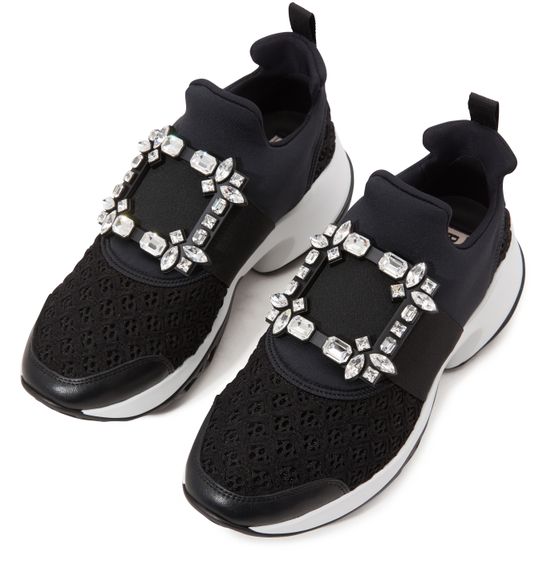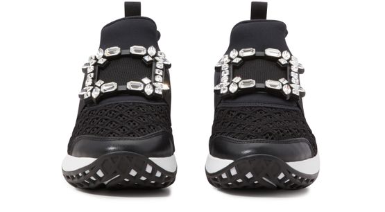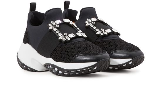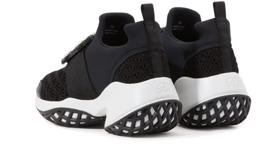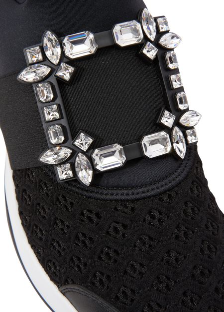 These Viv Run sneakers from the Roger Vivier collection display modern lines with iconic details. The square rhinestone buckle is a nod to the Belle pumps that marked the 1960s and the history of the Parisian fashion house. The house's heritage can also be seen in the soles of these sneakers, which include the fashion house's iconic curved heel.