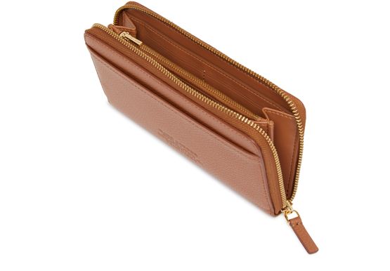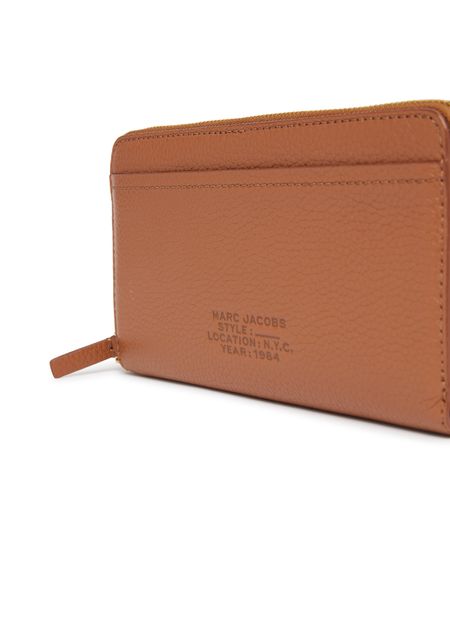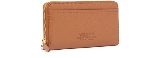 The Marc Jacobs Continental Wristlet wallet is a stylish accessory crafted from grained leather. It features a convenient leather handle for easy carrying. The front showcases the brand's logo and a practical patch pocket. Inside, you'll find multiple card compartments and zippered pockets for change and coins, secured with a zipper fastening.