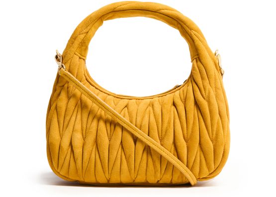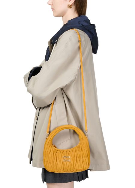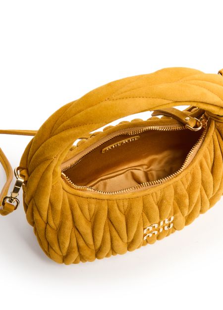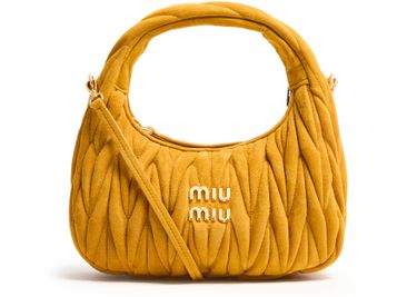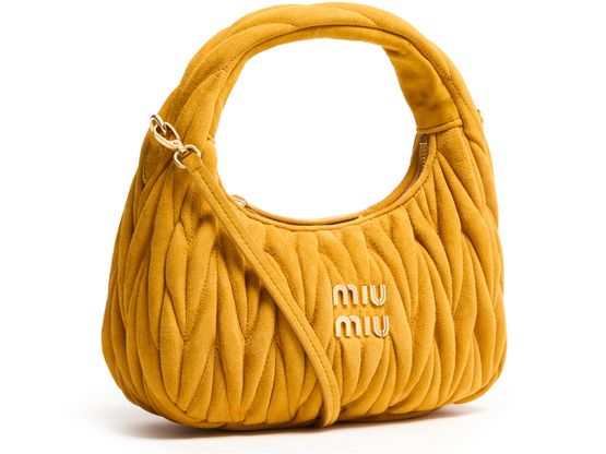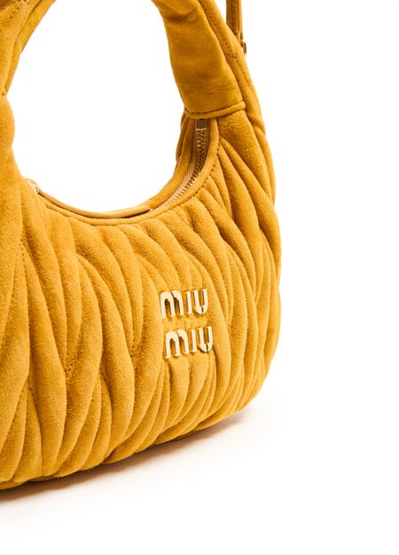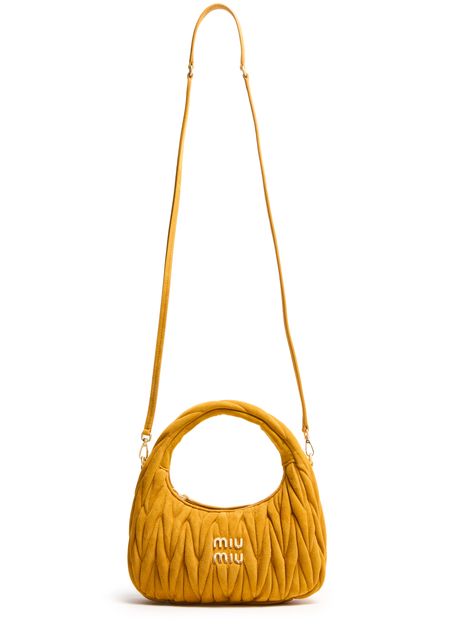 Indulge in Miu Miu's Wander hobo bag, designed to be hand carried or worn on the shoulder. The bag features a zipper closure, visible topstitching, and a striking logo in gold letters. Its minaudière clutch style is enhanced by a gold finish, single compartment, thin strap, and double handles.