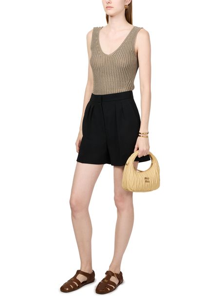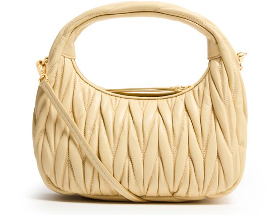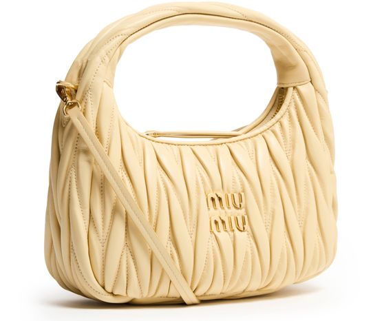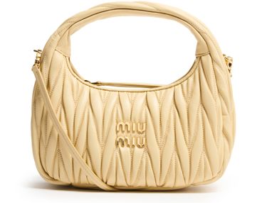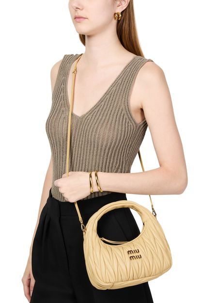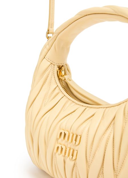 Unveil the Miu Miu Wander quilted nappa leather hobo bag, a masterpiece of style and functionality. Its metallic lettering and herringbone detail exude sophistication. The single handle and detachable strap offer versatility, while the zipper closure ensures your essentials are secure within the padded texture.