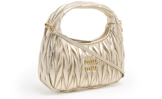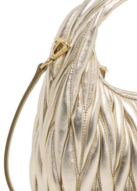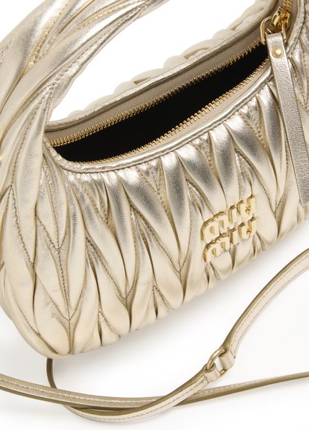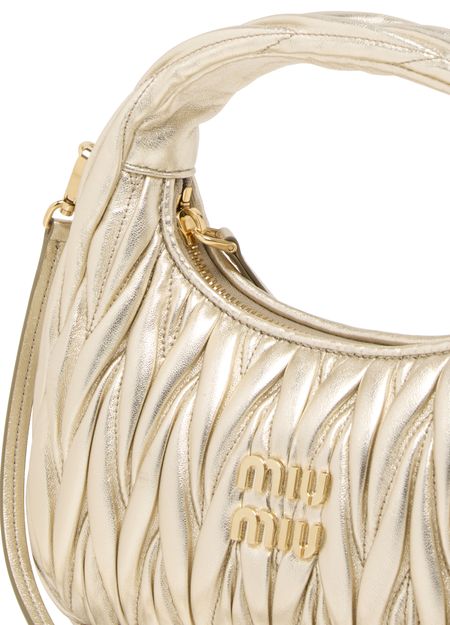 Unveil the Miu Miu Wander quilted nappa leather hobo bag, a masterpiece of style and functionality. Its metallic lettering and herringbone detail exude sophistication. The single handle and detachable strap offer versatility, while the zipper closure ensures your essentials are secure within the padded texture.