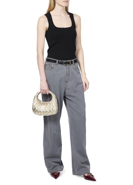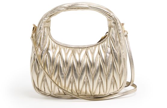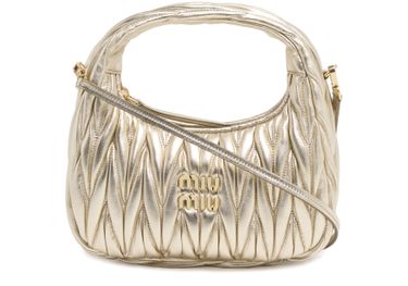 • Description : shoulder bag, metallic "miu miu" lettering, signature quilted herringbone detail, single handle, thin strap, detachable strap, single compartment, zipper closure, visible topstitching, front logo.