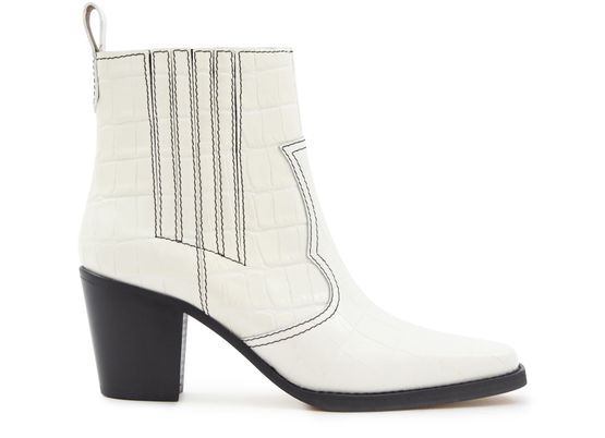 These Western boots are by Ganni. These wide heeled leather shoes are enhanced by contrasting topstitching.