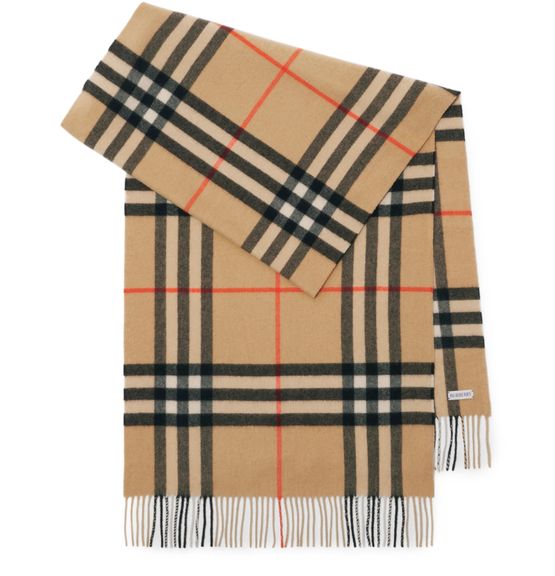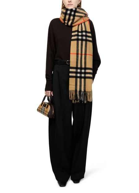 Reveal Burberry's check cashmere scarf, designed in an oversized style with fringed edges. This statement piece effortlessly elevates any look, offering both warmth and a contemporary touch. Experience the perfect blend of tradition and modern flair with this essential accessory.