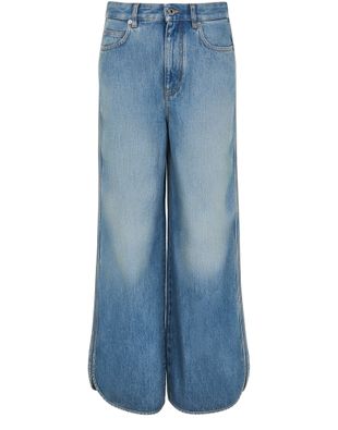 Unveil Loewe's wide leg jeans, a fashion-forward piece crafted from faded denim that offers a high-waisted fit. Designed with an ankle-length cut, these jeans feature a buttoned zipper closure, belt loops, and visible stitching. Enjoy the convenience of two front pockets and a back pocket, perfect for both casual and formal settings.